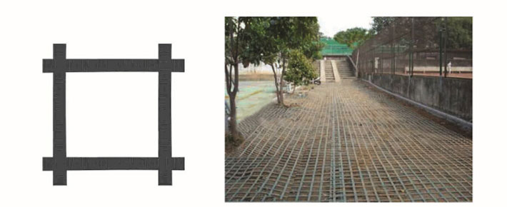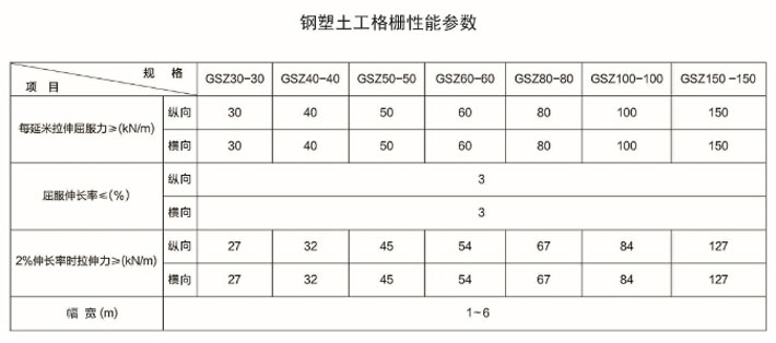 鋼塑復合土工格柵是用聚丙烯、聚氯乙烯等高分子聚合物經熱塑或模壓而成的二維網格狀或具有一定高度的三維立體網格屏柵。由于塑料土工格柵在制造中聚合物的高分子會隨加熱延伸過程而重新排列定向,加強了分子鏈間的聯結力,達到了提高其強度的目的。其延伸率只有原板材的10%~15%。如果在土工格柵中加入炭黑等抗老化材料,可使其具有較好的耐酸、耐堿、耐腐蝕和抗老化等耐久性能。